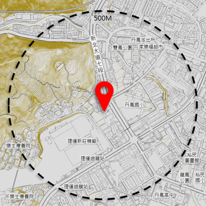- 周邊500公尺資源:迴龍站、雙鳳國小、丹鳳高中、雙鳳公園、丹鳳派出所…等