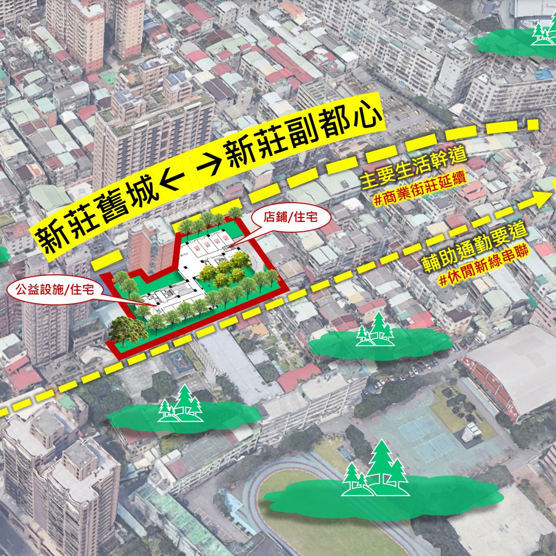 - 涵蓋綠色環保、優化周邊環境、現有巷睦鄰敦親改造、市有建物短期活化+捐贈公益設施等。